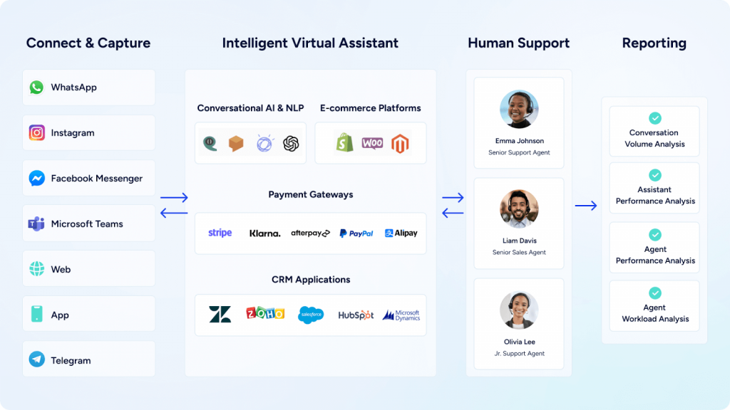 - AI-powered assistants that can provide suggestions and insights to human agents or directly resolve repetitive queries.