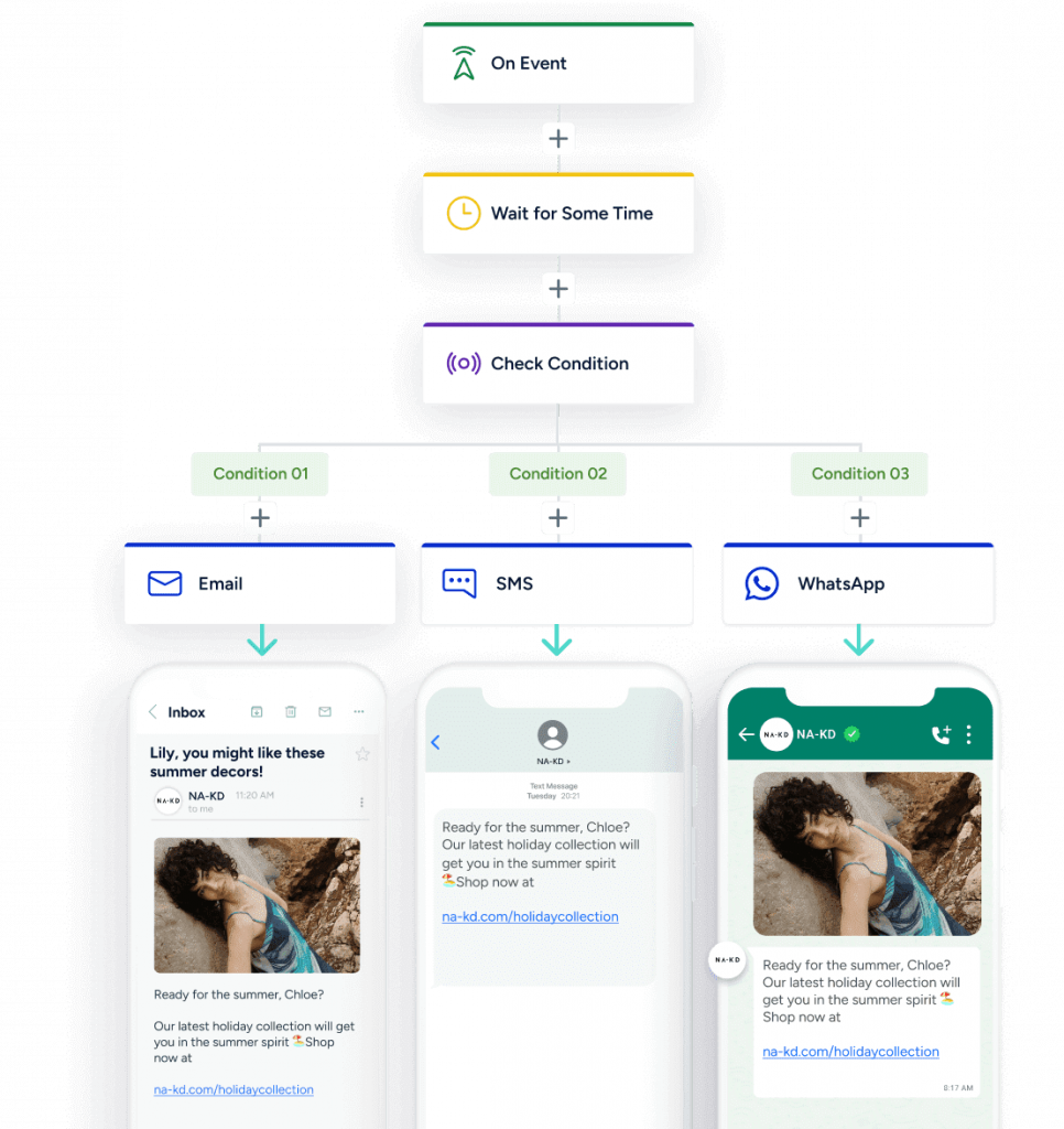 Most customer engagement platforms can facilitate interactions across multiple channels, like email, live chat, SMS, WhatsApp, Facebook Messenger, and so on. They also enable the creation of automated flows across these channels to reduce response times and ensure customer satisfaction.