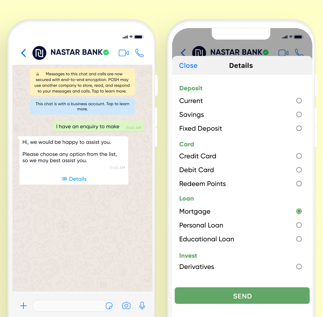 Meet the increasing demand for self-service through the world’s most popular messaging app. Initiate structured and unstructured conversations on WhatsApp for a variety of use cases, including applications, credit card upgrades, insurance enquiries, and more.