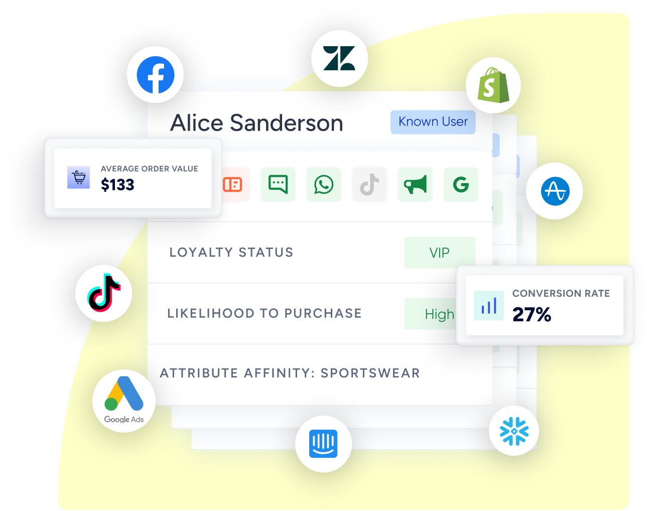 Combine and activate your data across multiple brands under the same parent company. Effortlessly access, manage, and segment your customer data to reduce CAC and increase ROAS, no matter which of your brands they’re engaging with.