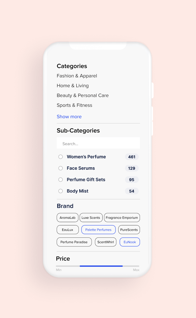 Acelera el descubrimiento de productos y la precisión de búsqueda ayudando a los compradores a encontrar lo que buscan más rápido. Configura filtros avanzados de facetas que ayuden a los usuarios a refinar los resultados de búsqueda en función de atributos de productos definidos como precio, categoría, marca y calificación.