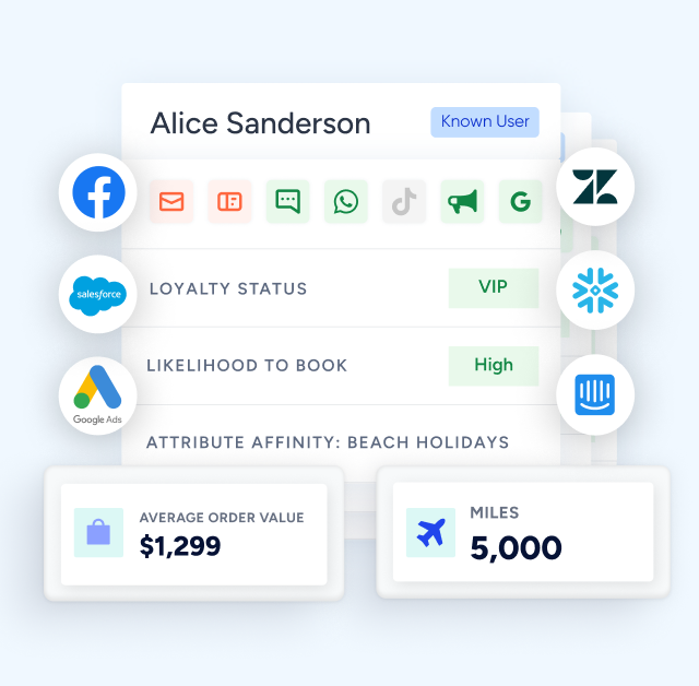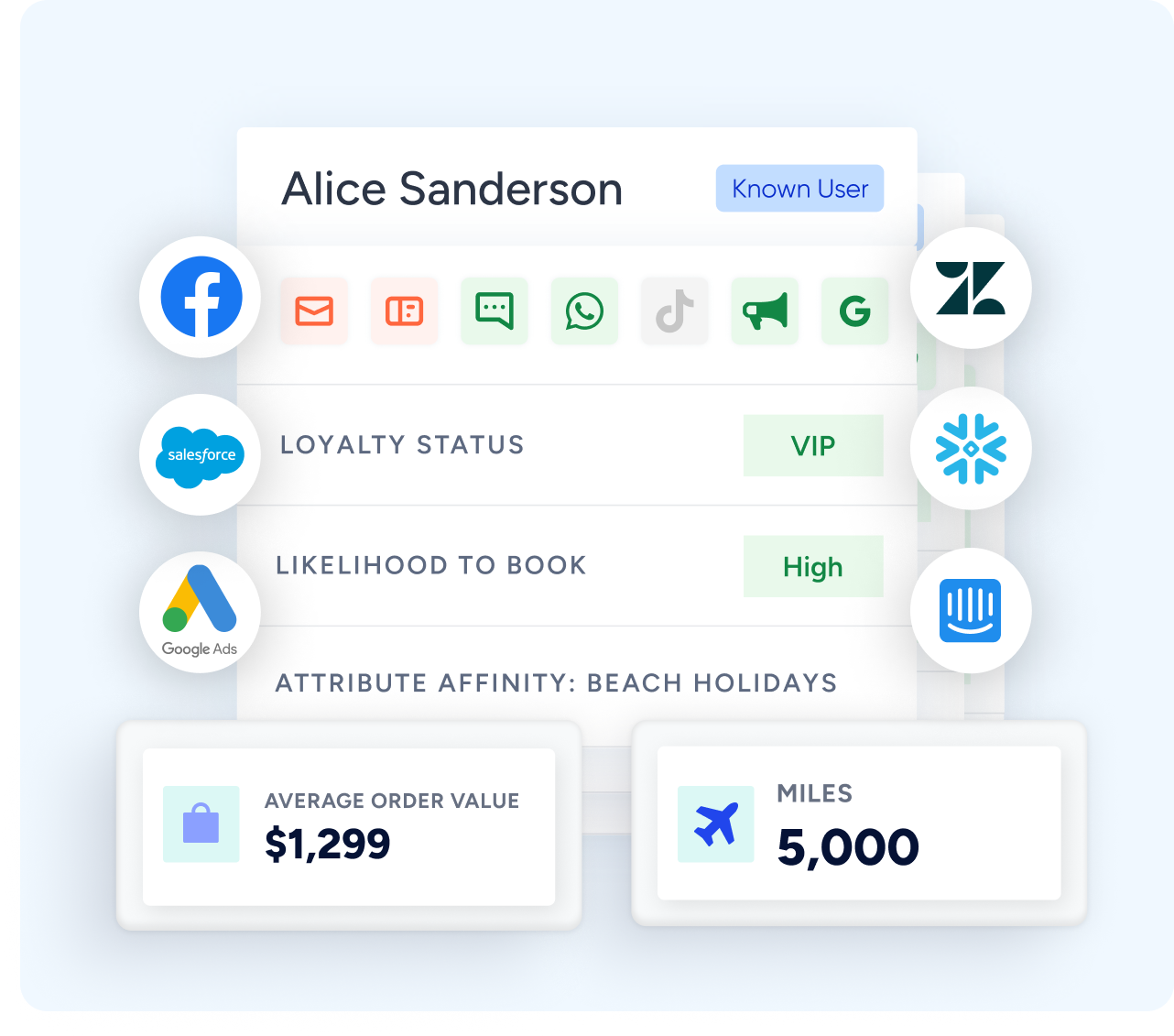 Recopile datos de clientes de todos los puntos de contacto para comprender las preferencias únicas de cada viajero. Aproveche la información de más de 100 fuentes, como CRM, sistemas de fidelización y atención al cliente.