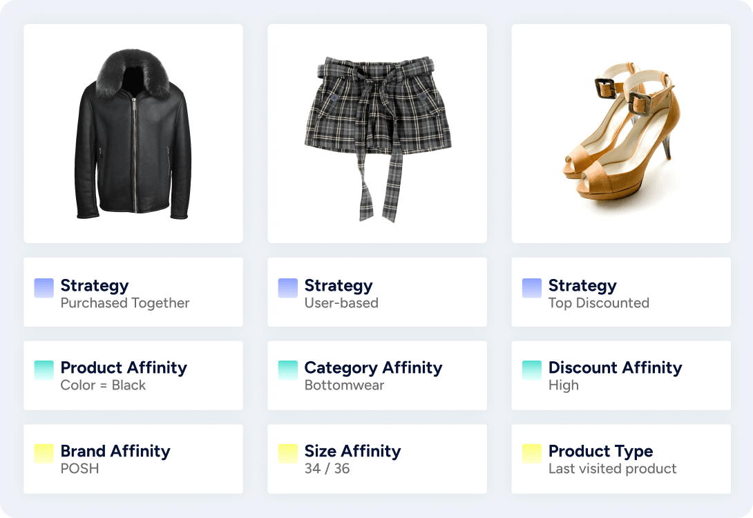 Put product discovery on autopilot with Al-powered recommendations for every customer. Leverage 20+ algorithms to deliver personalized experiences based on customer preferences like favorite brands, sizes, colors, and discount affinity. You can also engage both anonymous and new users with trending and highly popular products to ensure impactful results for every shopper.