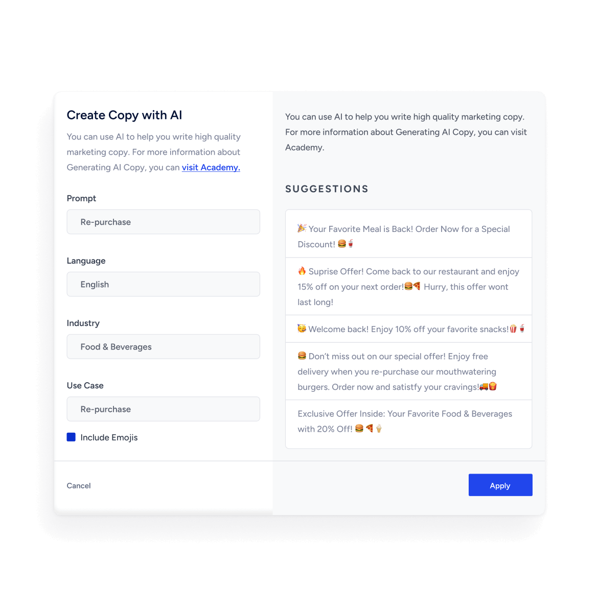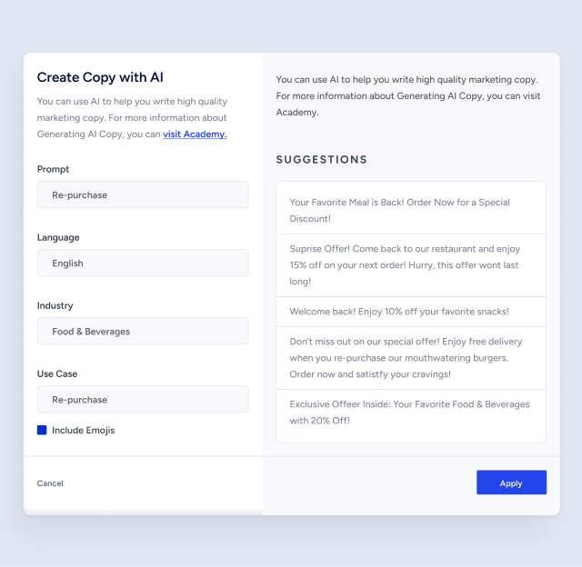 Incorporate AI-led localization to translate and localize campaigns with one click, based on the recipients’ language of choice.