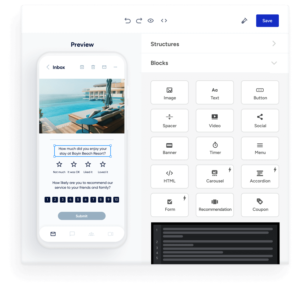 Insider’s industry-leading, user-friendly editor ensures easy customization by dragging and dropping elements like text, images, and buttons into your email template—no coding needed. Preview your email in real-time to ensure a streamlined experience on all devices.