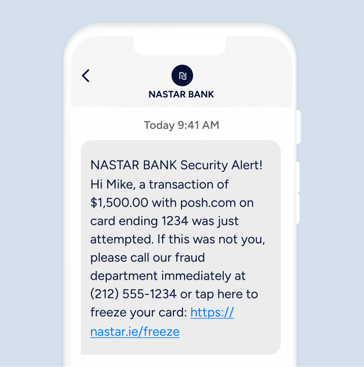 Use AI to monitor transactional behavior in real time. Instantly alert customers via SMS when fraud is suspected to facilitate fast action, reduce loss, and safeguard customer trust.