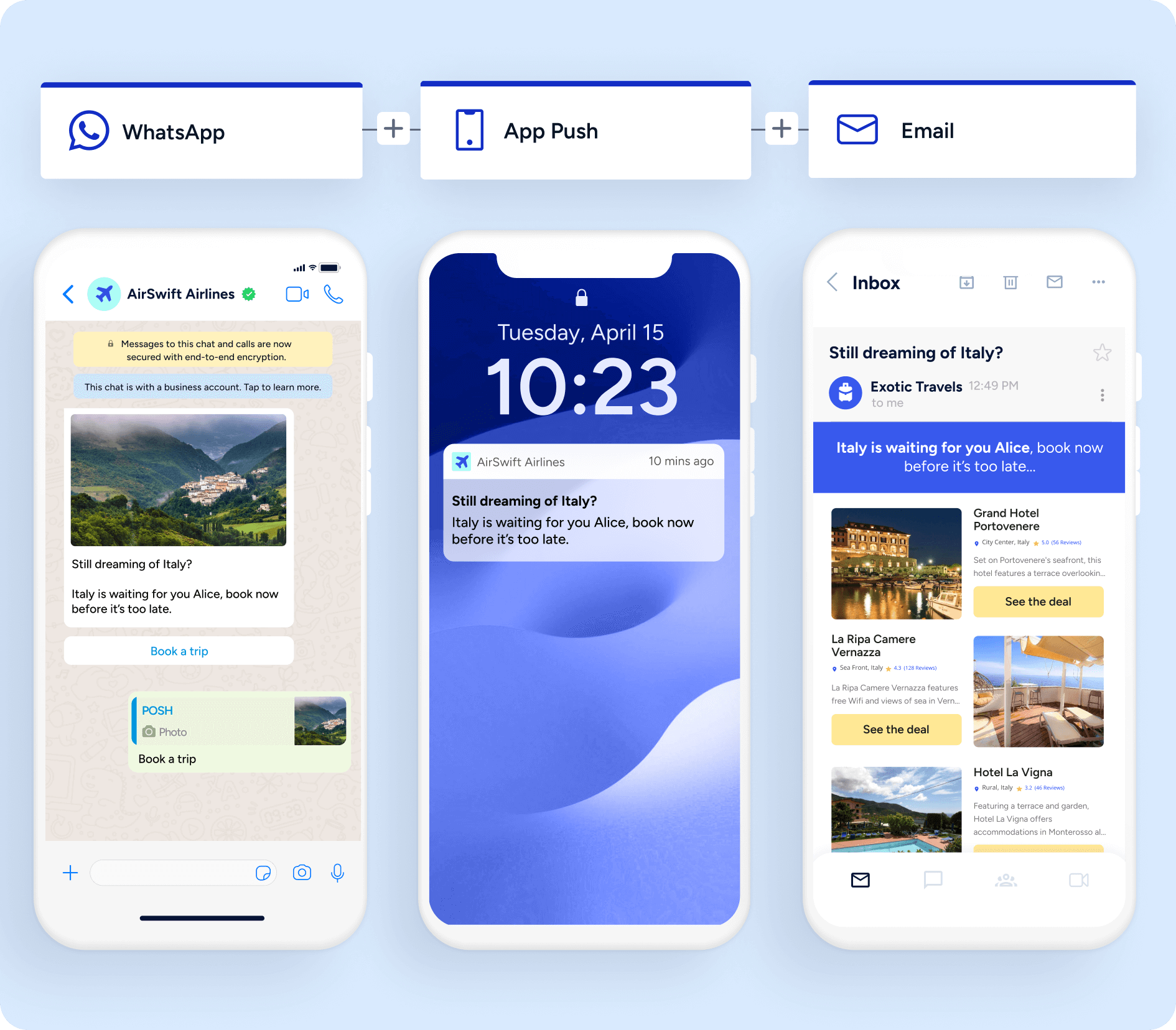 Deliver a consistent experience across 12+ channels. With AI-native features like Next Best Channel and Check Reachability, you can reach customers wherever and however they choose to engage.