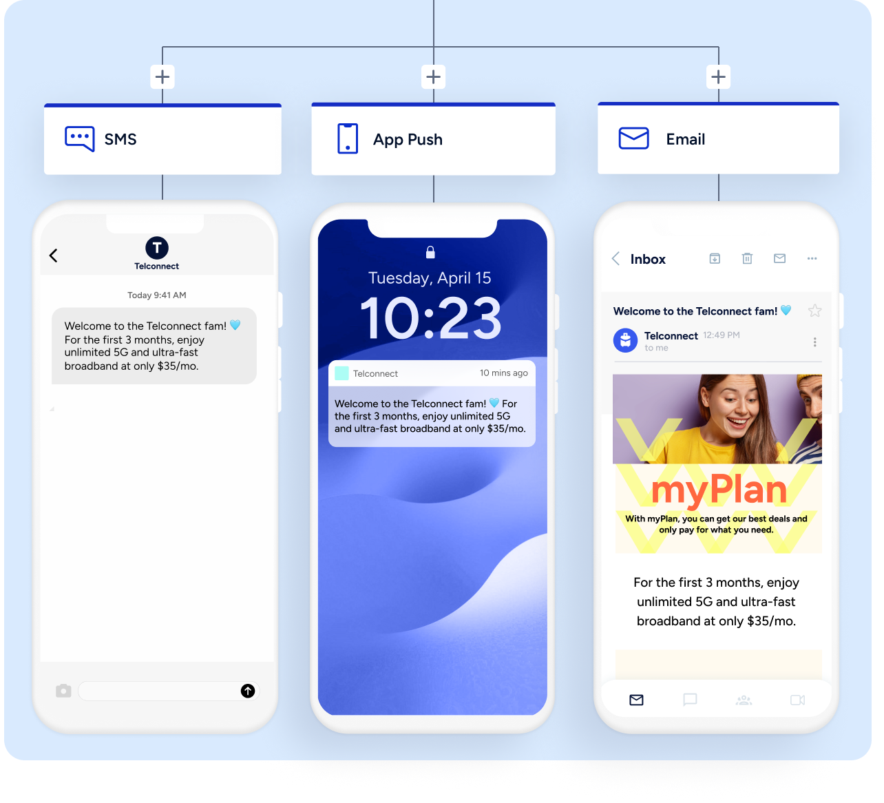 Unlock new revenue with cross-channel journeys tailored to the multi-touchpoint engagement cycle typical in telecom services. Telco users, who share highly personal data, demand heightened personalization across channels such as SMS, WhatsApp, App, Push Notifications, and Email. Ensure a seamless and unified experience across all touchpoints throughout the customer journey to enhance satisfaction and engagement.