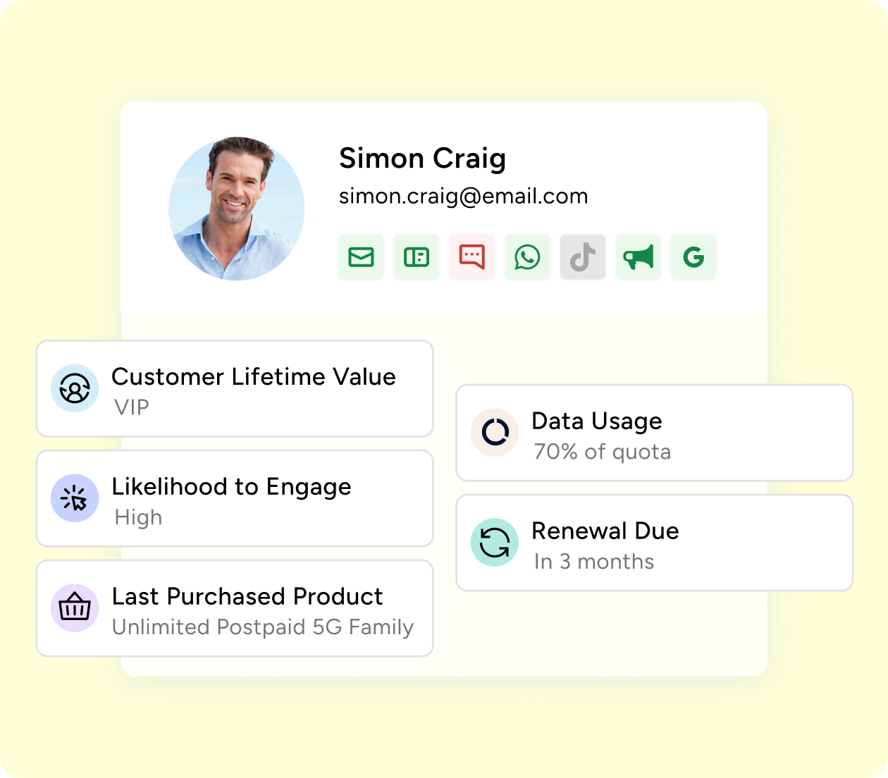 Provide impactful value through centralized customer insights by harmonizing subscriber data sourced from diverse sources, including in-house databases, offline stores, and digital interactions. This unified approach allows for a deeper, more precise understanding of users, enabling tailored responses that meet their needs at every stage of their lifecycle and engagement journey.