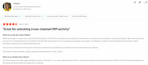 One big limitation of Braze that customers mention is its lack of a true CDP. Because of that, teams must organize their data in another solution and then pass it on to Braze, which creates a martech stack that’s more expensive and difficult to operate.