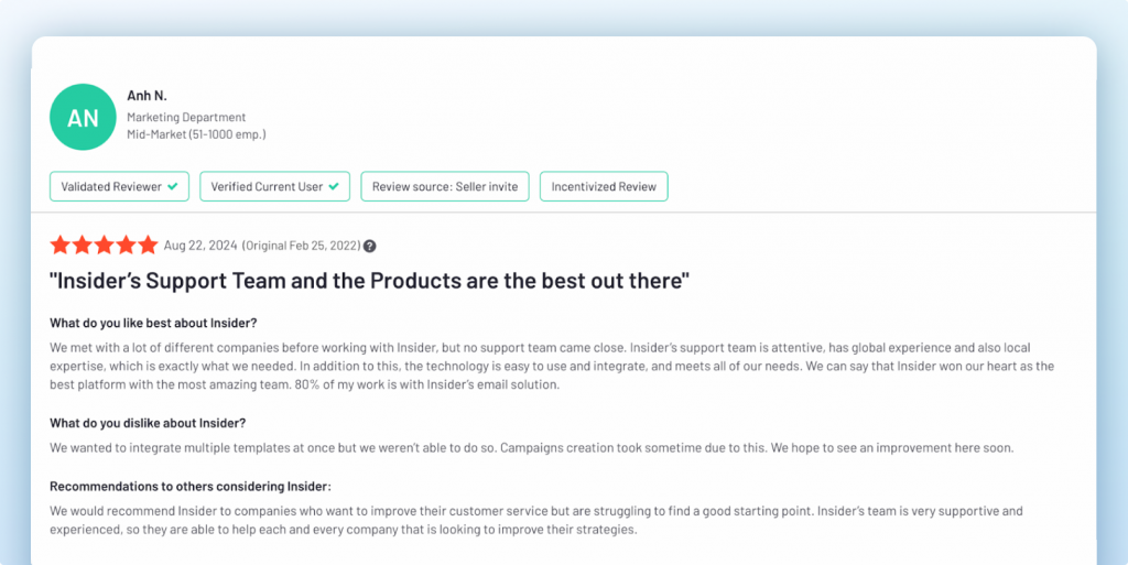 Our customers frequently highlight the difference Insider makes: “We’ve been working with Insider for more than a year now. What we really liked most about them was their team who supported us throughout the integration and implementation process. Their team has consistently provided us with the support that we needed.”
