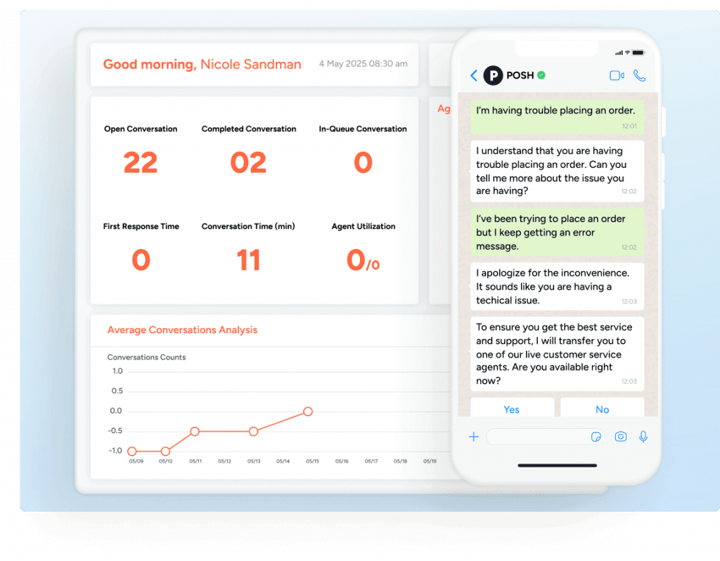 Our platform also makes it easy to hand over conversations to human agents whenever necessary to resolve customers’ issues. The agent dashboard shown below integrates with contextual customer data and bot conversation analysis to ensure queries are always handled in the best way possible.