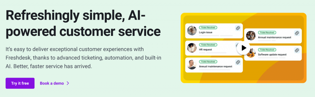 - Freddy AI Agent, which learns quickly from various sources (i.e., PDFs and other company documents) to deliver 24/7 customer support that fits any brand’s guidelines and tone of voice.