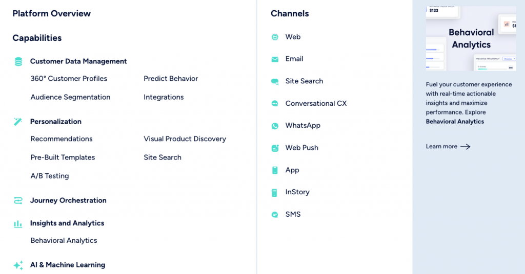 - Advanced website and mobile app personalization for tailoring all elements — including banners, categories, pop-ups, and product recommendations to visitors’ and customers’ preferences. This is essential for optimizing conversion rates and making the most out of your marketing spend.