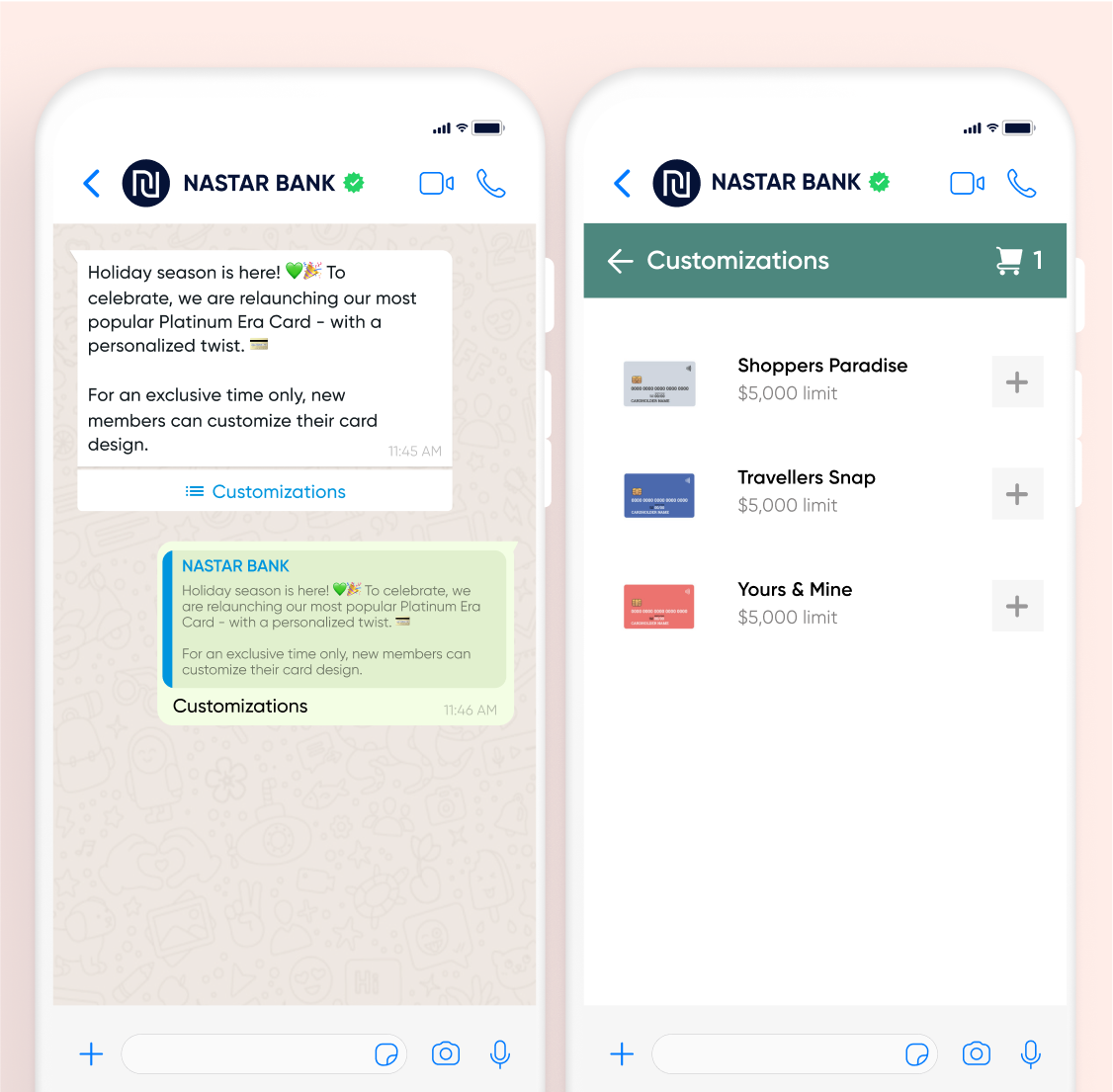 Meet the increasing demand for self-service through the world’s most popular messaging app. Initiate structured and unstructured conversations on WhatsApp for a variety of use cases, including applications, credit card upgrades, insurance enquiries, and more.