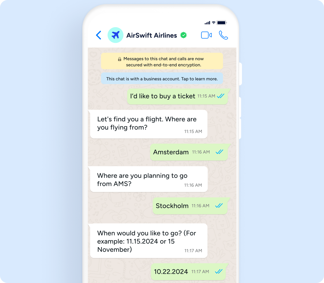 Permita a los clientes realizar compras complementarias en WhatsApp, desde cambiar asientos, añadir equipaje adicional, hacer pedidos durante el vuelo, etc.
