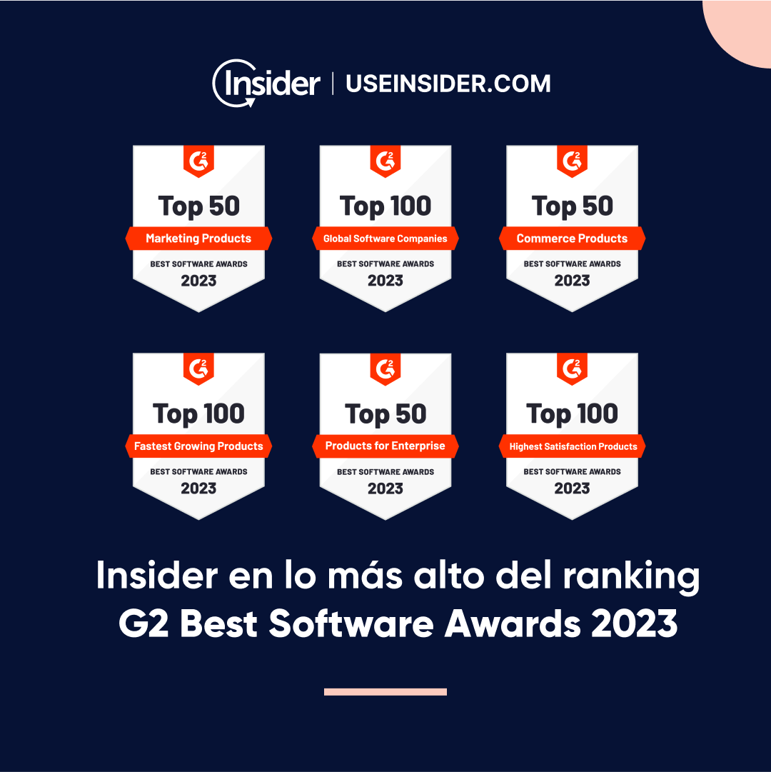 Insider fue elegido líder n.º 1 con la puntuación más alta de satisfacción del usuario (98/100) en los informes Spring’23 de G2 en siete categorías, que incluyen personalización, marketing móvil y plataformas de datos de clientes