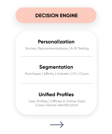 No puede brindar la mejor experiencia al cliente con datos fragmentados y dispersos en su pila de tecnología. Conecte los datos de los clientes desde su sitio web, aplicación, correo electrónico, CRM, punto de venta, centro de contacto y otras fuentes para obtener una vista de 360° de cada cliente. A continuación, puede ofrecer fácilmente experiencias multicanal personalizadas que encantarán a sus clientes. El resultado ? Fidelización de clientes y mejor retorno de la inversión.