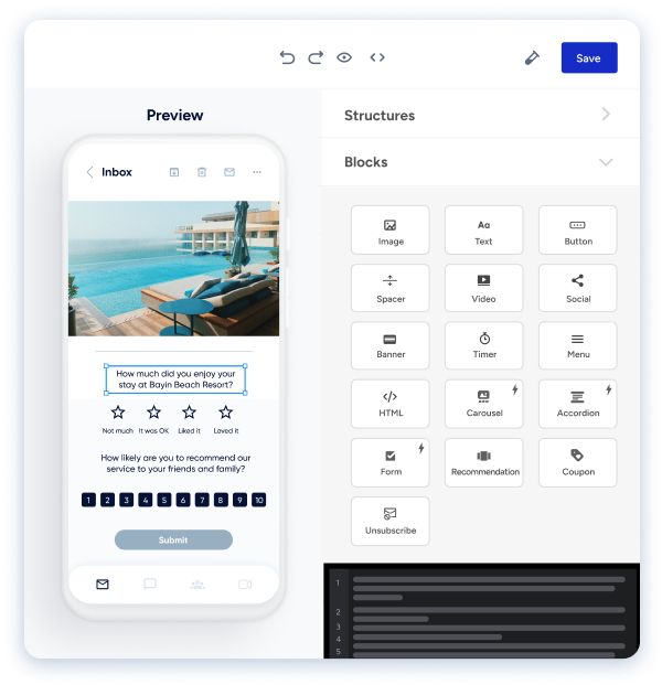 Insider’s industry-leading, user-friendly editor ensures easy customization by dragging and dropping elements like text, images, and buttons into your email template—no coding needed. Preview your email in real-time to ensure a streamlined experience on all devices.