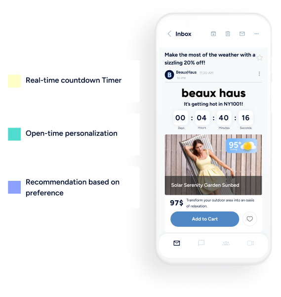 Deliver immersive, AI-powered experiences that stand out in the inbox – and convert. Use customer data combined with dynamic content in real-time to increase engagement and action
