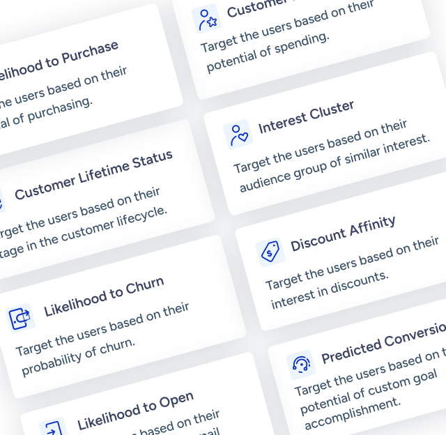 Drive conversions by targeting your audience based on expected behavior or actions, including likelihood to purchase or churn, customer lifetime value, and discount affinity.