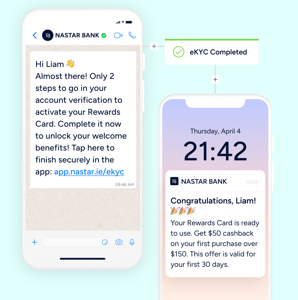 Recover users who abandon during eKYC with timely WhatsApp and app push nudges. Then guide them toward their first transaction to complete onboarding.
