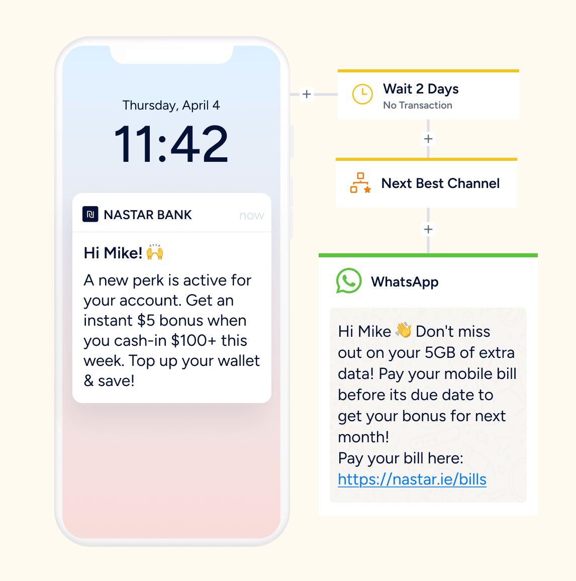 Trigger cross-sell and upsell opportunities based on customer behavior, financial milestones, or product lifecycle. Boost transactional frequency during the crucial Early Month on Book (EMOB) phase.