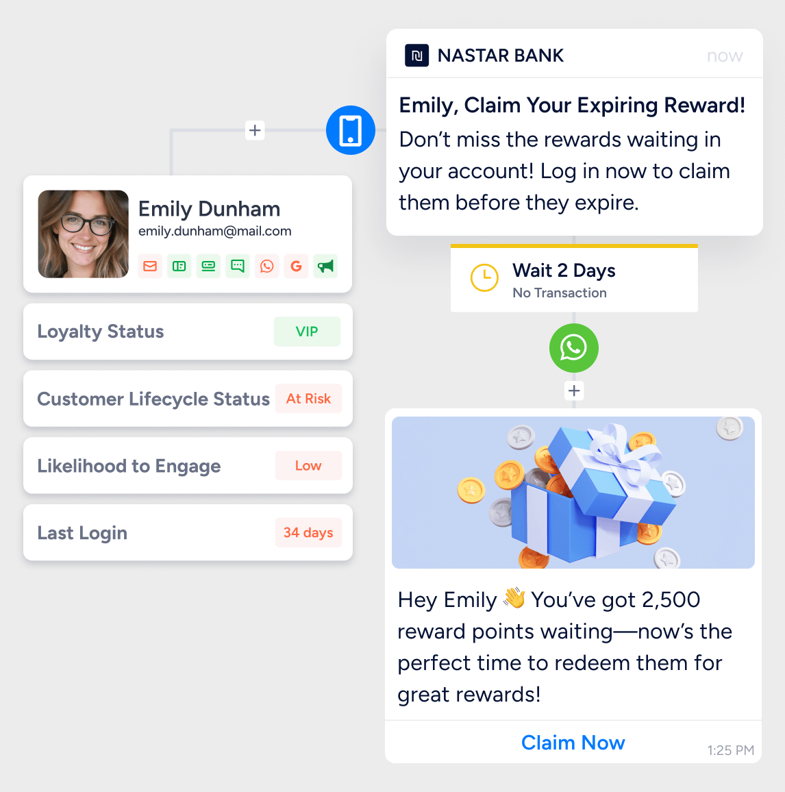 Turn first-time app downloads into daily users with gamified KYC and behavior-based offers. Drive repeat transactions and lifetime value with AI-powered segmentation across SMS, push, and in-app.