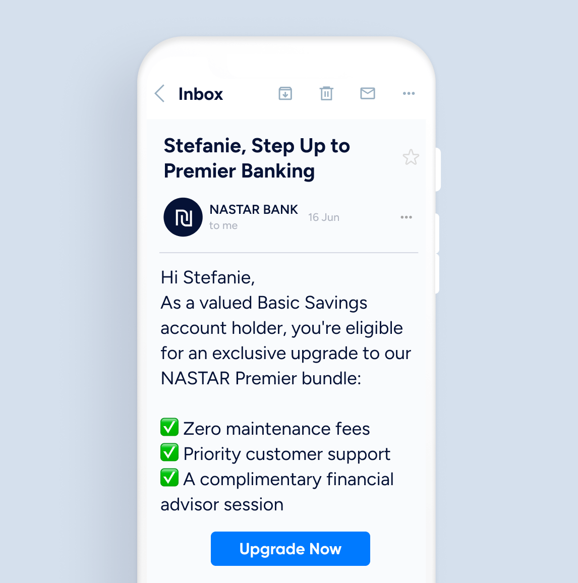 Win back disengaged customers through email campaigns offering bundled upgrades with real value. Give priority support, fee waivers, and loyalty rewards that spark action.