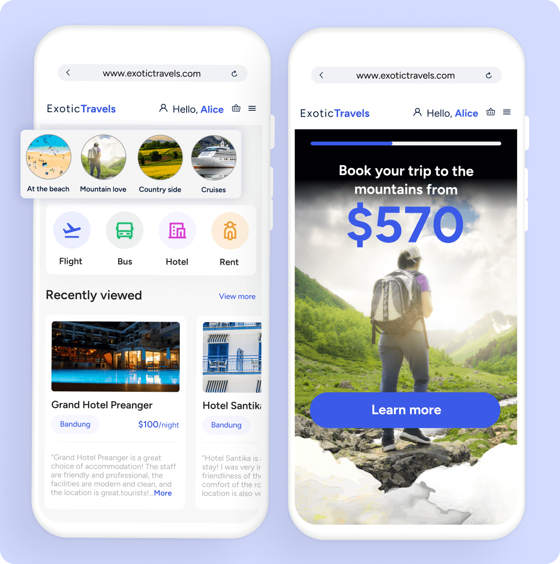 Highlight trending packages, recently viewed flights, location-based recommendations, and more with Insider’s Smart Recommender powered by AI.