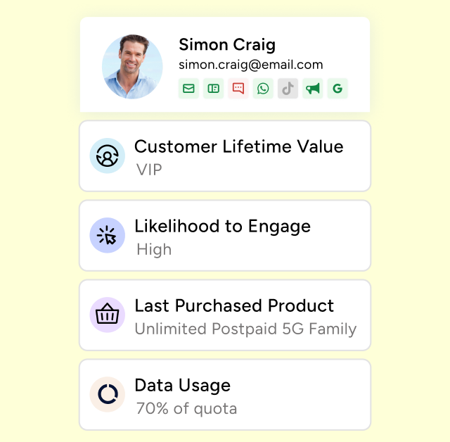 Provide impactful value through centralized customer insights by harmonizing subscriber data sourced from diverse sources, including in-house databases, offline stores, and digital interactions. This unified approach allows for a deeper, more precise understanding of users, enabling tailored responses that meet their needs at every stage of their lifecycle and engagement journey.