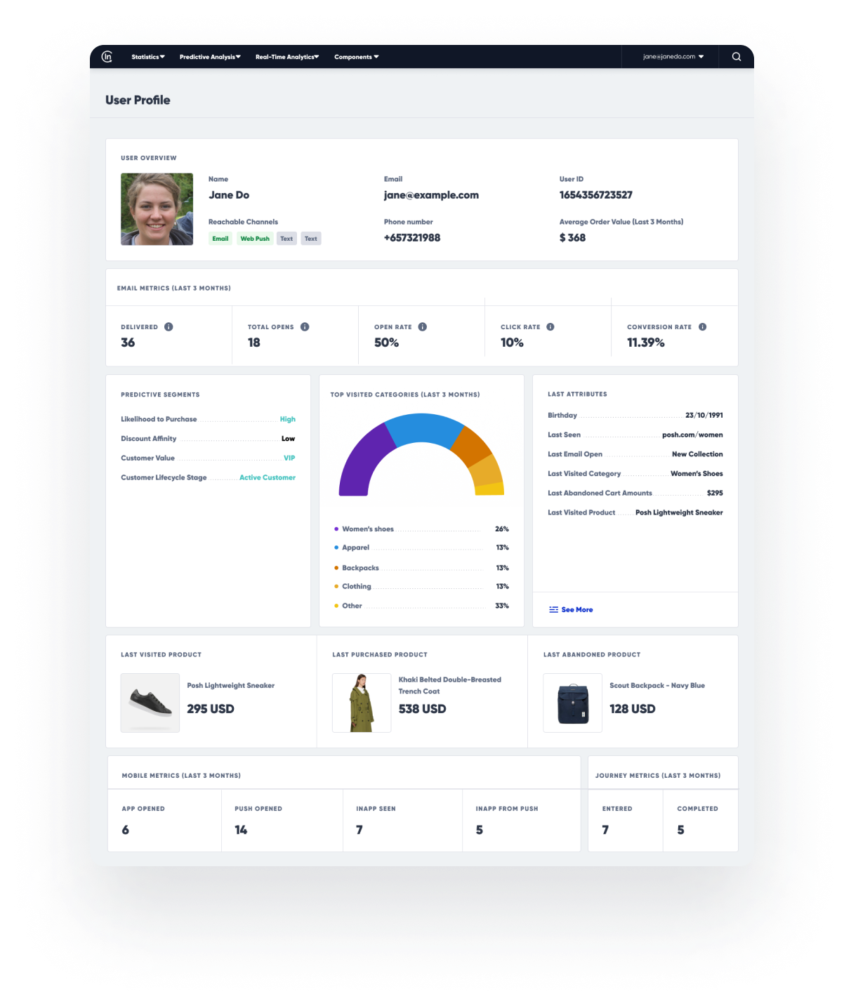 Insider empowers you to create highly-enriched customer profiles so you can serve personalized content and cross-channel product recommendations based on behavior, predicted likelihood to purchase, customer lifecycle stage, lifetime value, past purchase behavior, and much more.