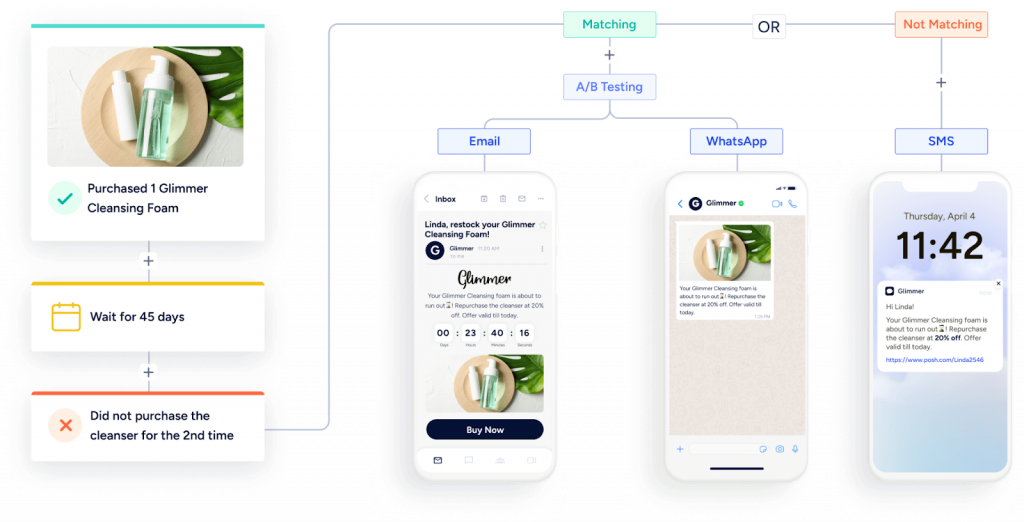 For example, you can start by engaging a certain segment with web push notifications and move on to email and SMS as a backup. Or, you can A/B test different messages and channels against each other to see which ones bring the most conversions and revenue.