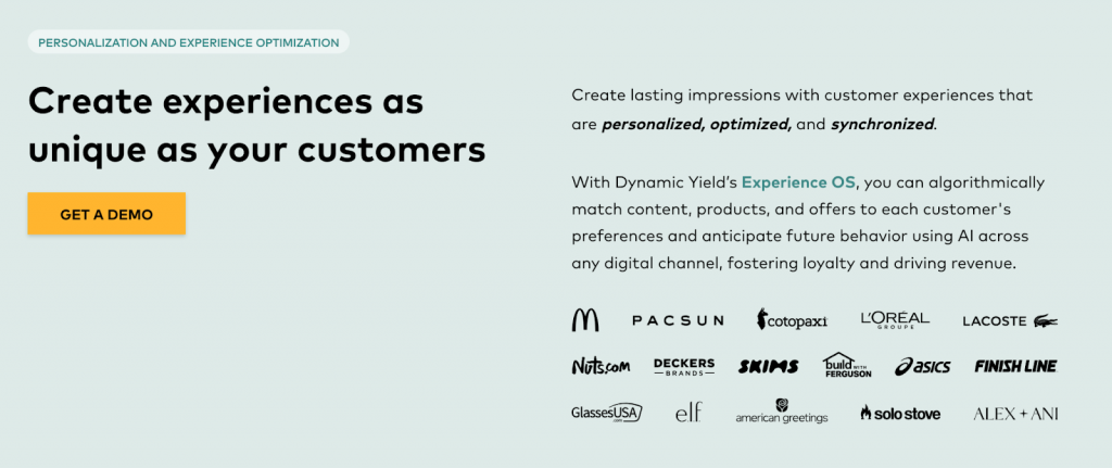 Dynamic Yield is a personalization platform for websites, mobile apps, and email marketing. It lets brands combine customer data from various sources, build detailed segments, and target them with personalized campaigns. It also has a product recommendation engine that helps determine what customers are likely to buy next. Lastly, DynamicYield offers seamless integrations for many popular marketing tools like FullStory, Twilio’s SendGrid, and TypeForm.
